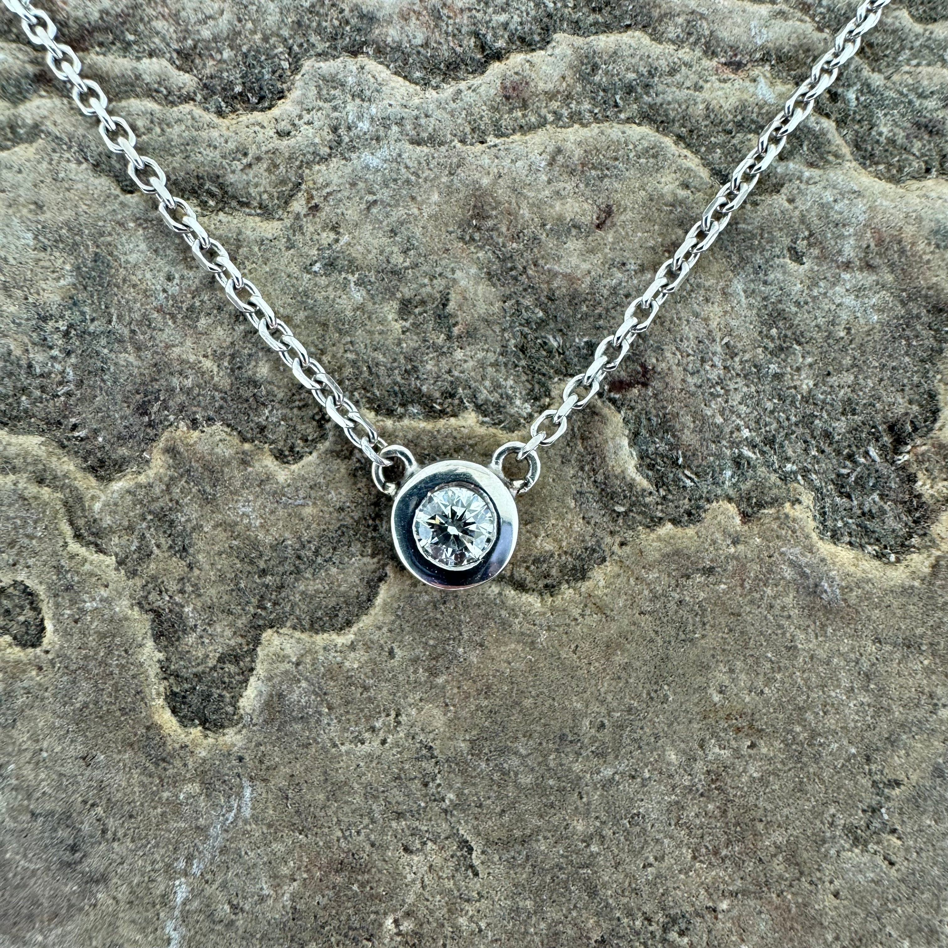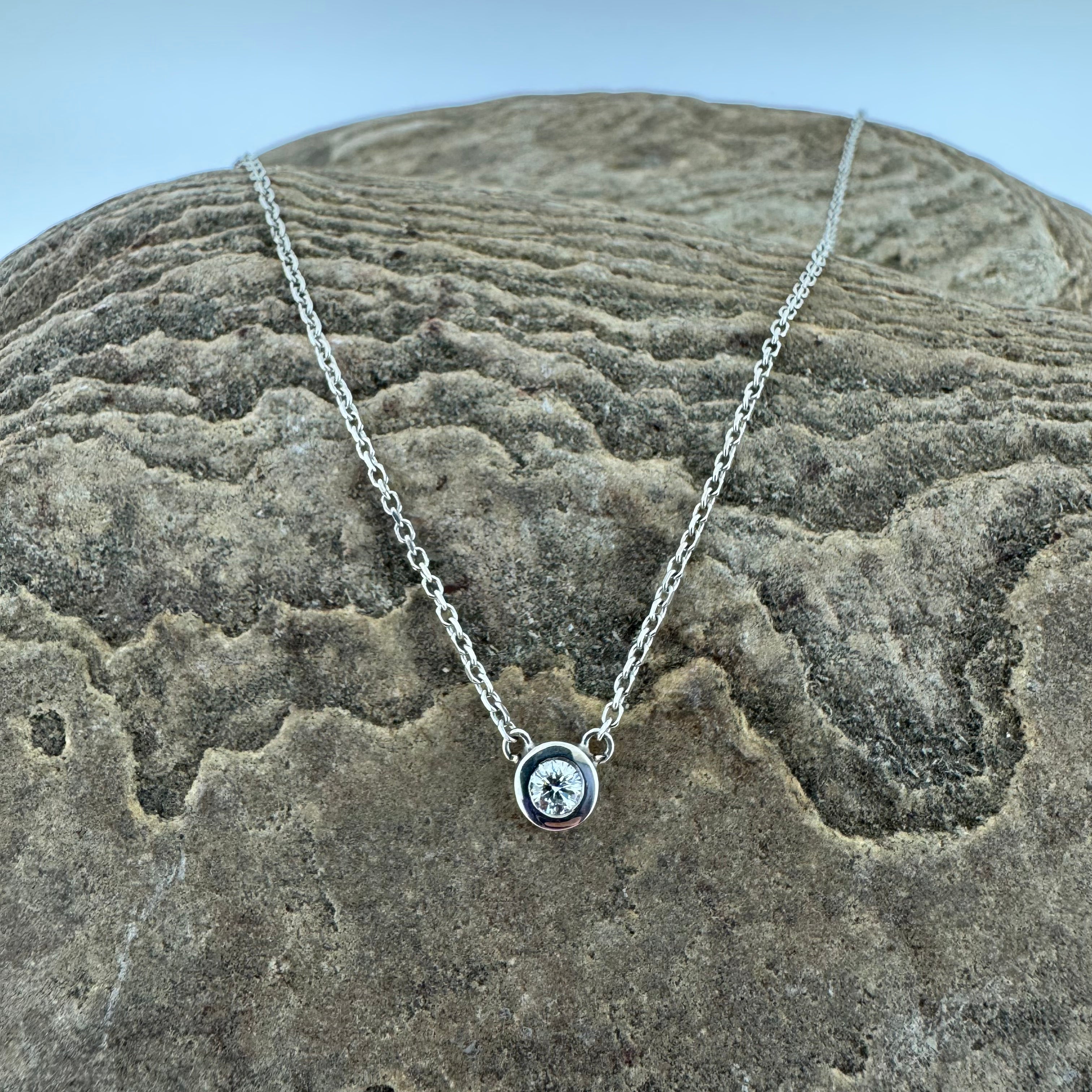 This beautiful classic diamond solitaire necklace features a 0.24ct (4mm) diamond set in 9ct white gold. It is on a rub set donut setting and is on a 18” 9ct white gold trace chain. The perfect piece to be worn everyday and suitable for every occasion.