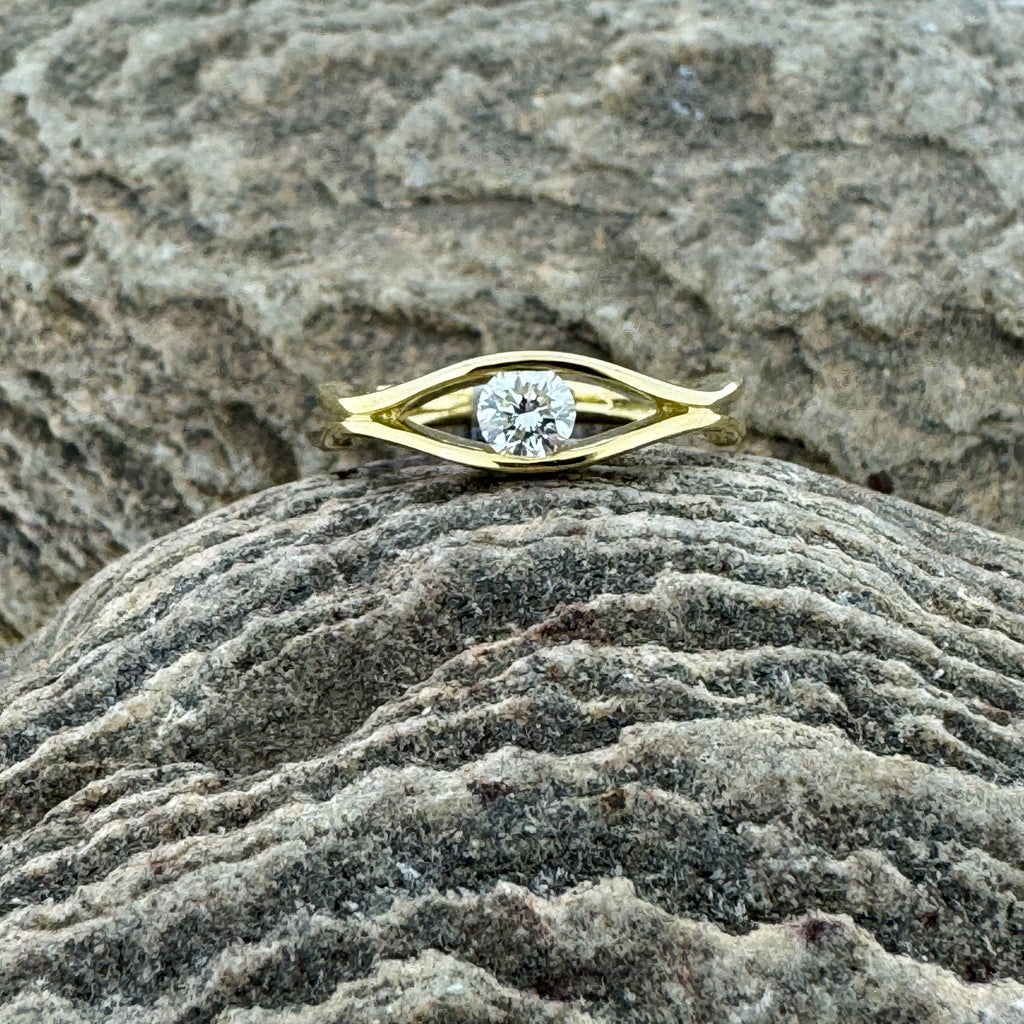 This beautiful contemporary 18ct yellow gold and diamond solitaire would make the perfect engagement ring or dress ring. Two bands undulate around the ring like waves with the diamond held in the middle. Featuring a 0.25ct diamond. The finger size is M (mother).