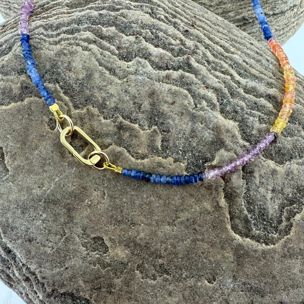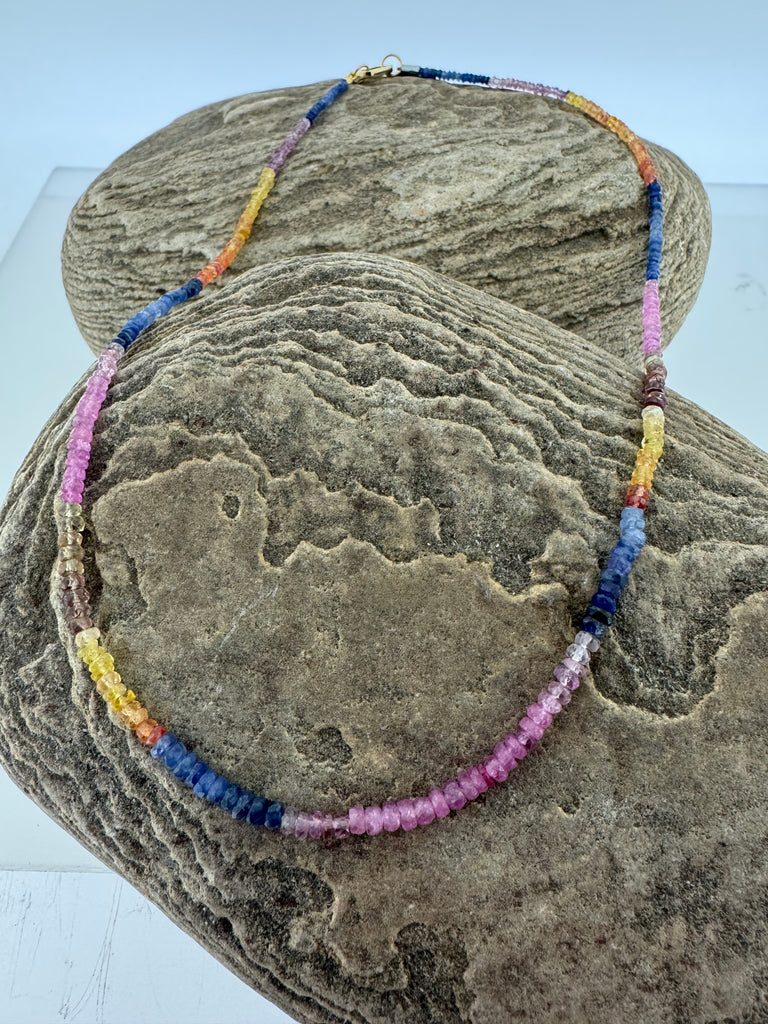 This multicoloured sapphire necklace features faceted gemstone beads in a spectrum of colour. Perfect to brighten any outfit. The fittings are 9ct yellow gold and the beads graduate from 3.6mm to 2mm. The necklace is 18’’.