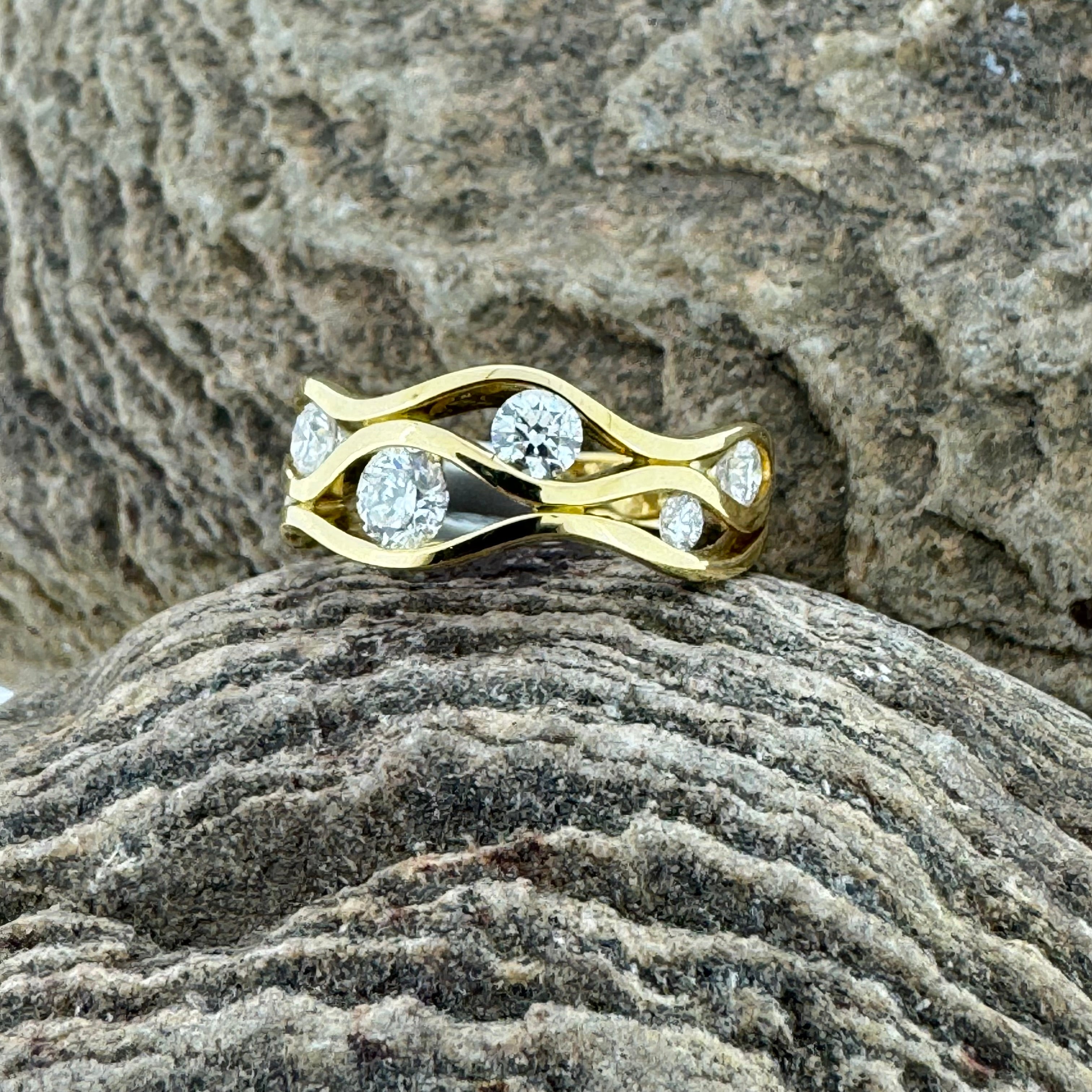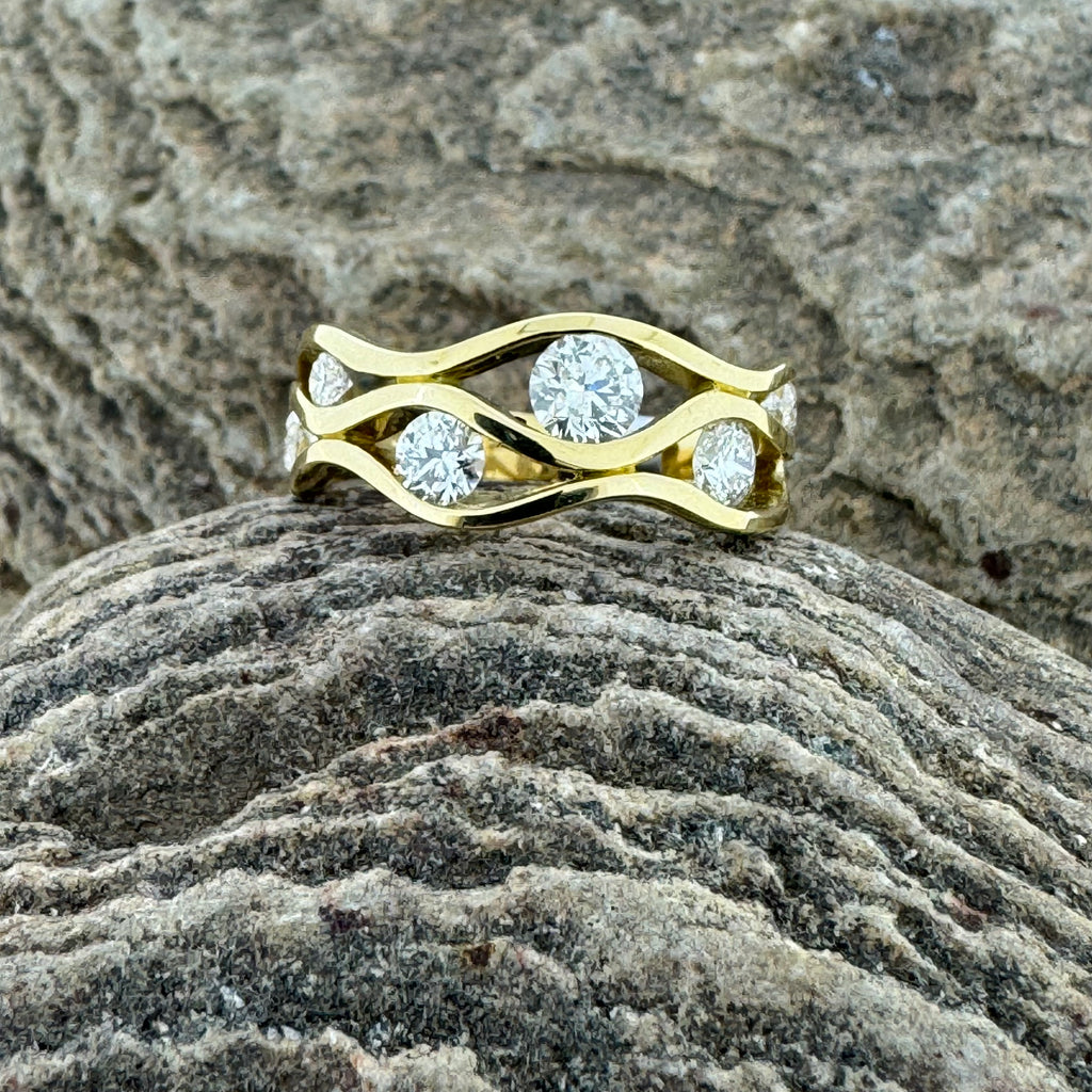 This gorgeous wave style diamond ring is a real statement piece! Round diamonds are set between 18ct yellow gold bands and with 0.87ct total carat weight, there is definitely plenty of sparkle. Finger size N - November.